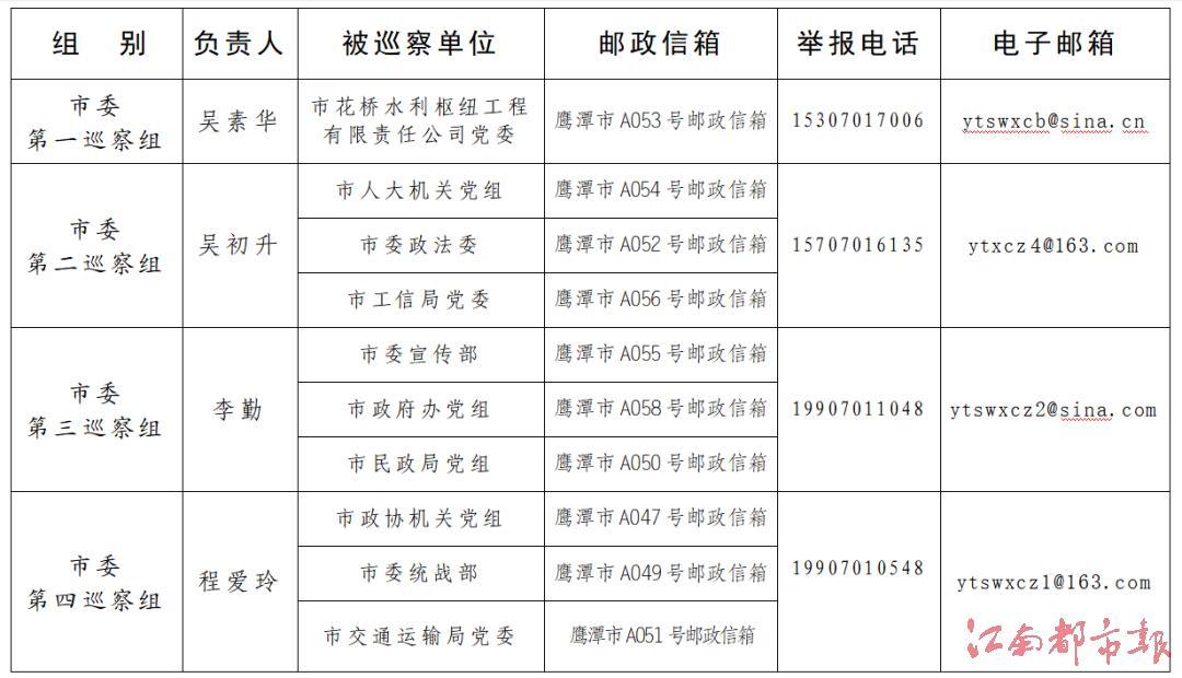 根據安排,本輪巡察在被巡察單位工作時間為兩個月,5月中旬前結束。期間,專門設立了郵政信箱、舉報電話、電子郵箱,受理反映被巡察單位領導班子及其成員、其他縣級干部、下一級黨組織領導班子主要負責人和重要崗位領導干部問題的來信來電來訪,重點是關于違反政治紀律、組織紀律、廉潔紀律、群眾紀律、工作紀律和生活紀律等方面的舉報和反映。對不屬于巡察受理范圍的信訪問題,市委巡察組將按照分級負責、屬地管理原則,轉交紀檢監察機關和有關部門處理。(市委巡察辦供稿)