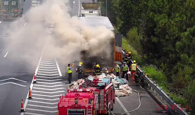 當天11時30分,江西省交通投資集團贛州管理中心監控員接到報警,切出監控畫面發現現場貨車正在冒煙,煙霧越來越濃。隨即,迅速通知固村車輛救援隊、交警前往現場。在大家的共同努力下,13時許,火勢得到有效控制,消防員協助轉移、清理車上貨物后撤離現場。經調查,此次事故因輪胎著火引起。