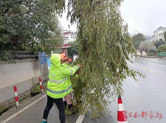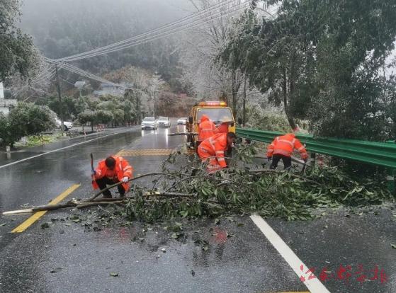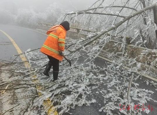 “巡查發現G319國道K1091至1206有多棵樹木倒伏,請速來支援!”5日晚上7時,伴隨著一陣急促的電話報告后,該市湘東公路中心迅速啟動惡劣天氣應急預案,開展路面清障工作,源并道班人員立即在該路段擺放安全警示標志,并疏導車輛。樹木上已經結了1~2厘米厚的冰凌,道班人員只能交替使用油鋸、鐮刀,將倒伏的樹干、樹枝砍斷再轉移。經過當晚4個多小時的緊張處置,倒伏在路上的樹木全部被清除,該路段恢復正常通行。該中心共出動巡查、養護人員57人、養護車7輛,人工、機械撒布融雪劑約1噸,清理倒伏樹木350余棵。