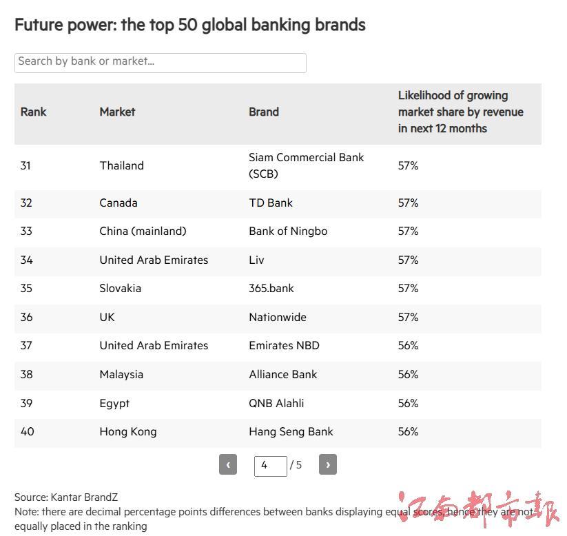 該榜單由凱度(Kantar)和英國銀行家雜志聯(lián)合發(fā)布,根據(jù)客戶感知來評判銀行在未來12個月內(nèi)的品牌價值增速,是否獲得了與其規(guī)模相符的良好品牌資產(chǎn)得分,即該銀行是否正在有效地打造其品牌。