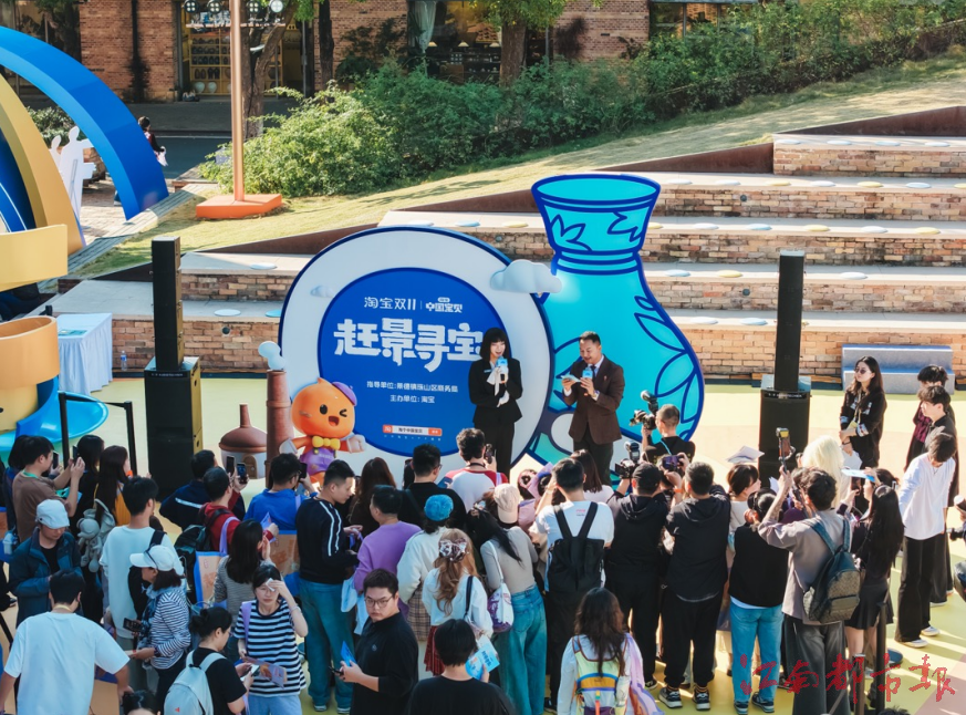 同步開啟的還有城市尋寶活動,千余名中國寶貝獵人在陶溪川“趕景尋寶”,最快完成任務的玩家將可拿走一萬元現金大獎。陶溪川內大量游客和市民則被中國寶貝現場的打卡互動和優惠折扣所吸引停留,大家踴躍蓋章打卡領取限定周邊禮品,還能以雙11優惠基礎上的折上折拿下手作好物…中國寶貝儼然成為一張“寶藏地圖”,淘寶帶著年輕人在煙火氣中觸摸非遺的創造力。